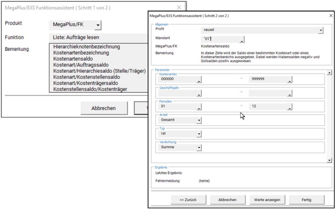 Es lassen sich fast alle gängigen betriebswirtschaftlichen Auswertungen in Excel abbilden. Ein Funktionsassistent unterstützt Sie bei der Auswahl der vordefinierten Lese-Funktionen und überprüft gleichzeitig Ihre möglichen zusätzlichen Eingaben auf Richtigkeit.